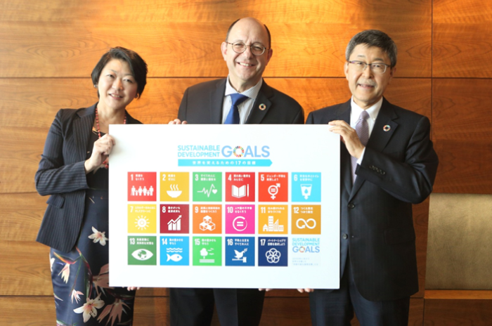 到访嘉宾与户田总经理手持博报堂DY集团协助开发的日语版可持续发展目标图标留影纪念。从左至右依次是,联合国宣传中心的Kaoru Nemoto所长、联合国助理秘书长托马斯•盖斯、博报堂DY Holdings董事长兼总经理户田裕一。