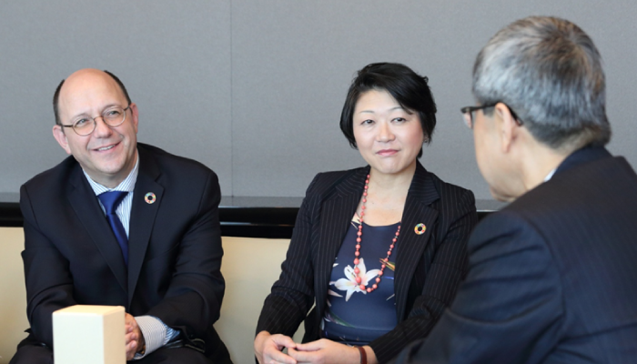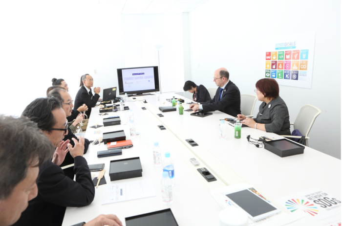 联合国经济社会部助理秘书长、负责政策调整及机构间合作的托马斯•盖斯、联合国联合宣传中心所长Kaoru Nemoto于10月27日(星期五)到访本公司,就达成可持续发展目标的理想,促进理解可持续发展目标的企业努力,与户田总经理交换了意见。之后,两位贵宾还与我公司参与可持续发展推进的员工举行了联谊会,盖斯助理秘书长(以下简称为盖斯)为大家作了各种相关报告,加深了大家对可持续发展目标的理解。