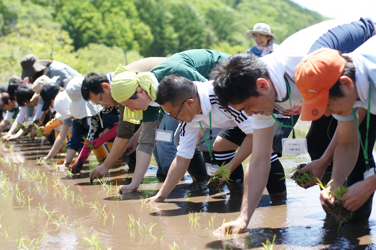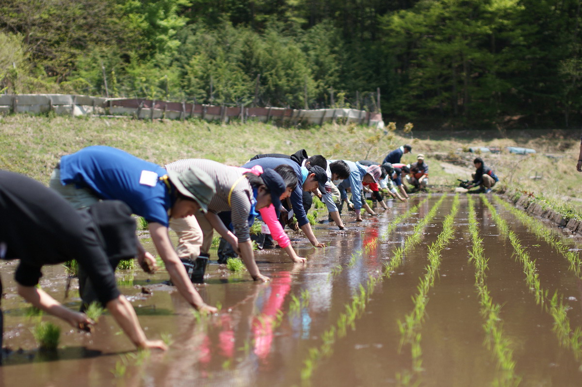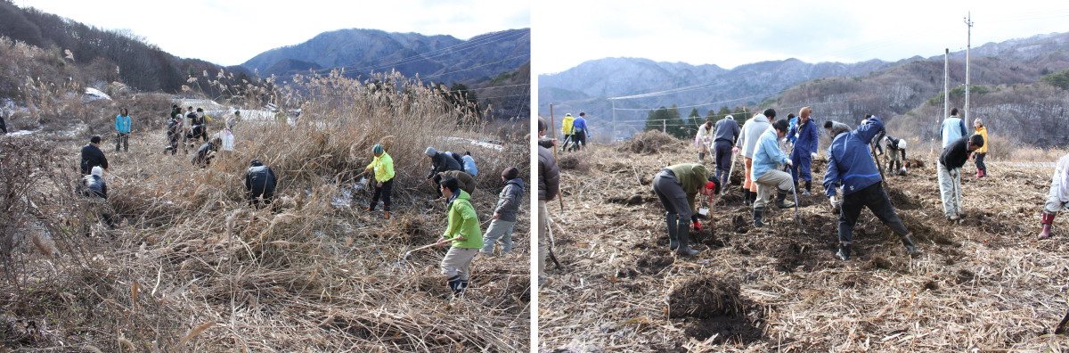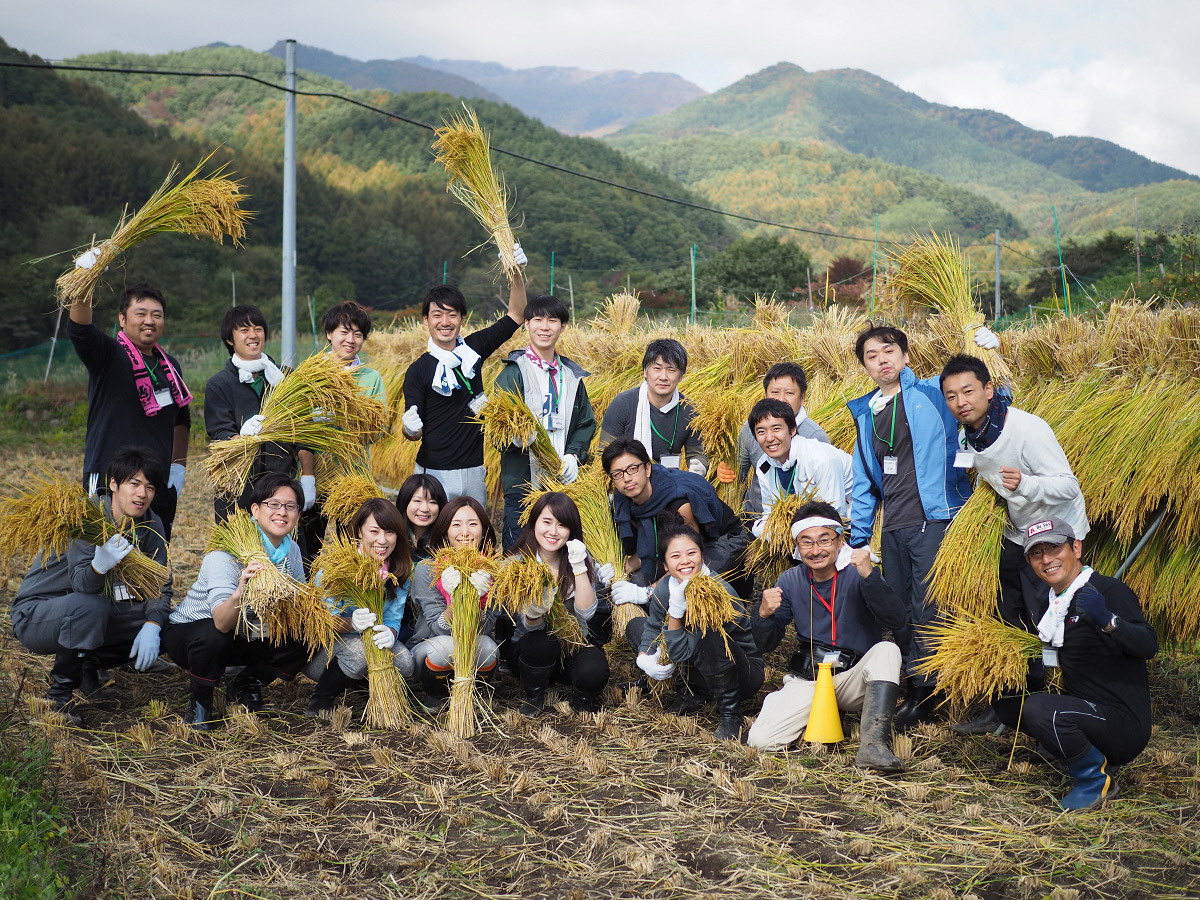 我们的作业场所在山梨县北杜市增富地区,主要农作业包括开垦、插秧、除草、收割。增富地区有很多放弃耕作的农地。在被放弃耕作的田地里杂草丛生,如果不说以前是田地谁都不会认为是那是田地。参加者一起坐巴士奔往农地,车外的风景渐渐改变,等到达目的地时,所有参加者看到这般荒芜田地都茫然自失了(笑)。不仅自然自语“确定要在这里进行农作业?”但是,不可思议的是,农作业开始后,吃了午饭、泡了温泉、吃晚饭时再干一杯。之后的所有参加者的表情和整个氛围变得和早晨完全不同的好。