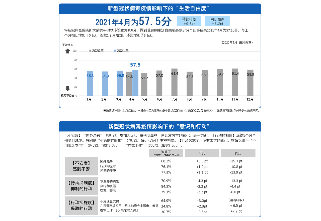 4月的“生活自由度”为57.5点,连续两个月增加
