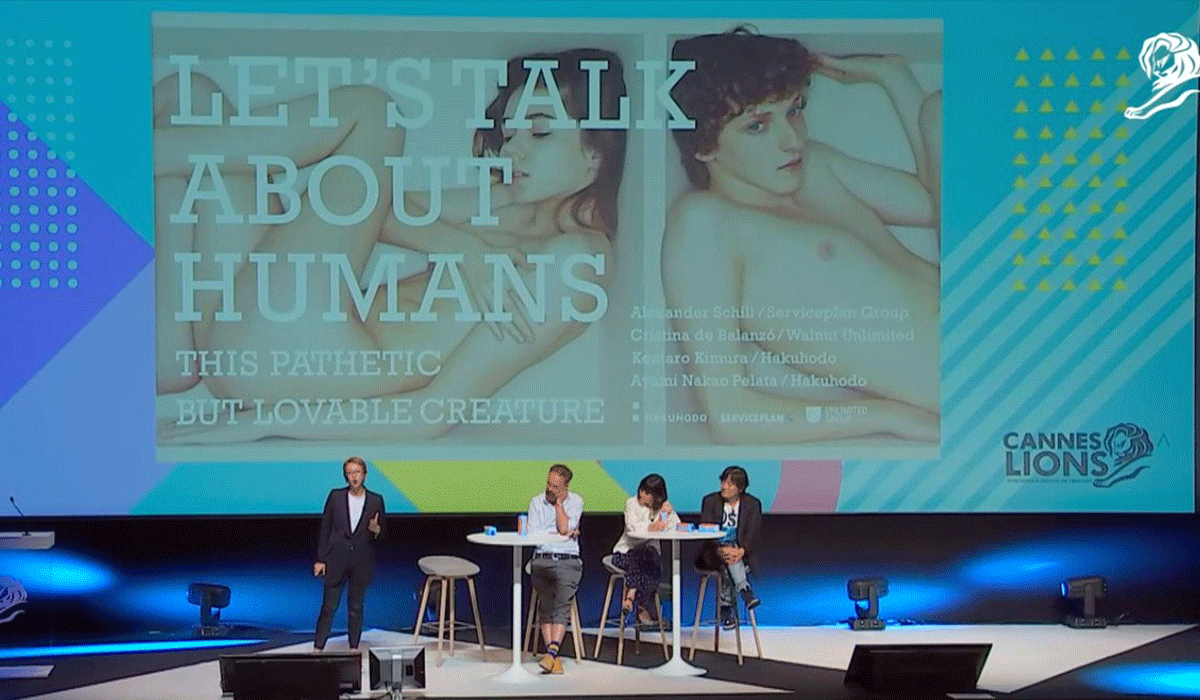 三位业界顶尖人士来到法国戛纳,齐聚博报堂举行的研讨会上,并分享他们通过个人创意作品观察到的人类社会现状。他们分别是:来自东京的木村健太郎(株式会社博报堂);来自伦敦的Cristina de Balanzó,(Walnut Unlimited公司,隶属于Unlimited集团);以及来自慕尼黑的Alexander Schill(Serviceplan集团)。会议由博报堂的中尾文美女士主持。