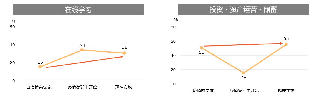 虽然有保守的一面,但是为了克服疫情带来的经济危机,生活者开始致力于提高个人技能并不断提升自我的人群正在不断增加,最近“付费自习室”不仅被学生们使用,也被成年人所接受。根据生活综研(上海)的调查结果,“考虑为将来生活做准备”的意识正在提高,“线上学习”、“投资、资产运用、储蓄”、“加入商业医疗保险”等在新冠疫情结束后也在稳步发展。