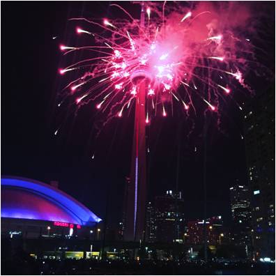 观看Canada DayCN塔例行烟花大会。今年也因为正值加拿大建国150周年,热闹非凡。