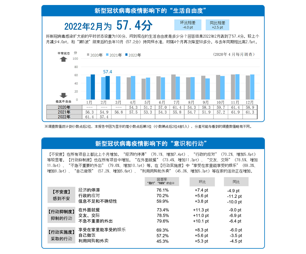 株式会社博报堂(总部:东京)的智库博报堂生活综合研究所于2022年2月,就最近新型冠状病毒流行的生活者意识和行动实施了“关于新型冠状病毒的生活者调查”(调查期间为2月1-3日,对象范围:首都圈、名古屋、大阪神户圈的20-69岁的男女1500名,调查概要参照4页)。