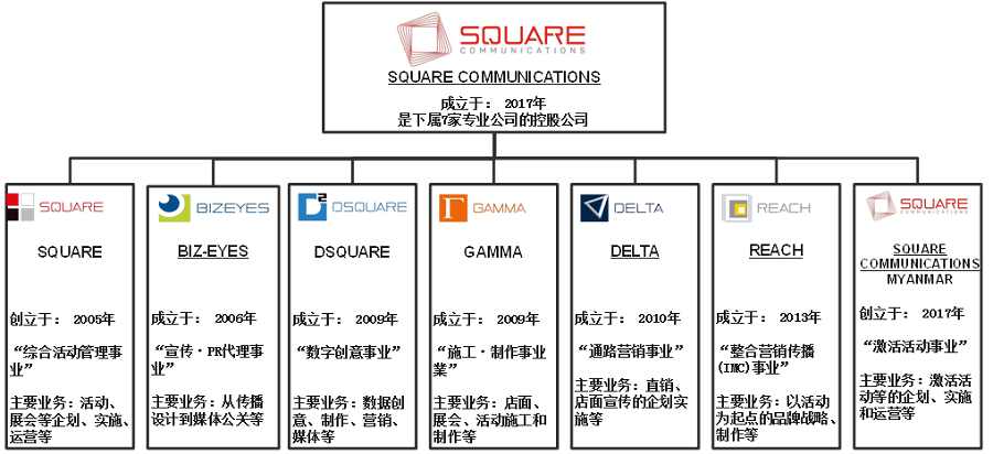 集团公司原本创立于2005年,创始人共有四人。该公司的业务覆盖活动实施、制作、展会、室内制作、互动营销(Engagement marketing)、直销、PR传播、数字传播等多个领域,向客户提供高质量的整合营销传播服务(IMC: Integrated Marketing Communications)。该公司旗下有七家专业子公司,以其高质量的服务获得了众多客户和社会的信赖,其业务也处于不断上升趋势。