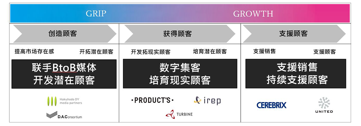 此次的解决方案名称包含了获得顾客(GRIP),培育客户企业的商务和顾客(GROWTH)之意,所以命名为GRIP&GROWTH。