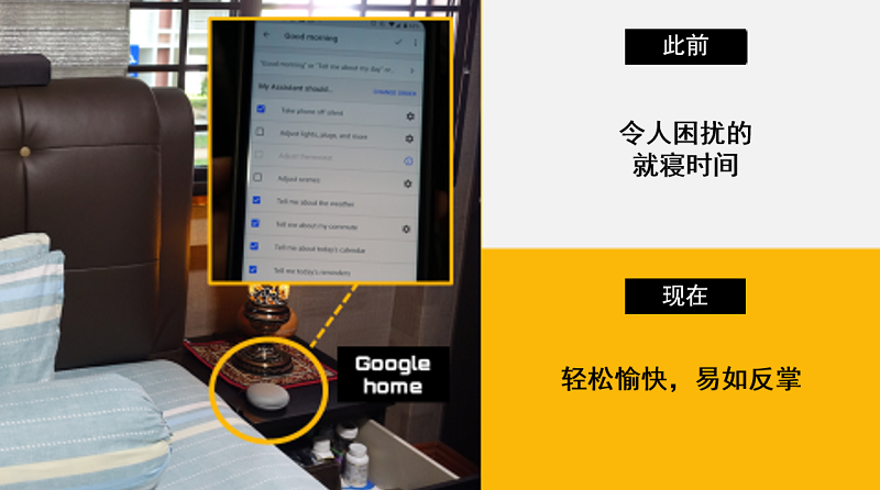 这位新加坡人使用物联网为妻子创造了休闲的生活。他将家庭设备和地毯与智能音箱连通,并且设计了自己的指令。他只需要给智能音箱下达指令,就能完成许多睡觉相关的准备工作,关闭设备、关灯、拉窗帘等等,一应俱全。