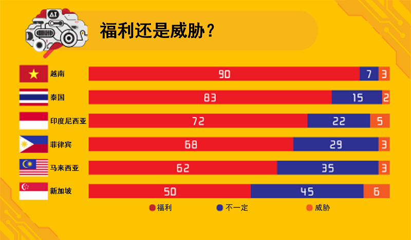 生活者对AI技术是如何看待的呢?我们可以看看各个国家对“AI技术是福利还是威胁?”的回答。越南有90%的受访者将其视作福利,而仅有50%的新加坡受访者认同这一观点。在各个国家中,人们对新技术的喜厌并不一致,这可能取决于发展阶段或者民族特征。
