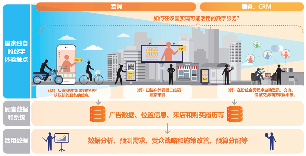 不过正如开头所说的,在海外围绕着数字&数据的环境、当地企业的资源和合作伙伴企业等情况也因国家而异,因此日本的成功案例并不能原封不动地套用,更别说在同一个东盟里的各国,普及的SNS和通话app各国也不同。预先定好配合各个国家生活者的客户旅程表,如何引导顾客,让他们体验什么样的内容呢?如何连接到客户的价值链上呢?