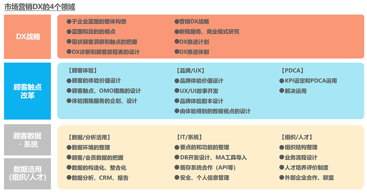 在逐渐增加的有、业务数字化和数据活用在内的CX(顾客体验)措施提案、电商战略、CRM(顾客关系管理)的运用、自媒体和相关服务的UX/UI开发,为了更深入地活用这些框架构和数据,构建和运营CDP(Customer Data Platform客户数据平台)等等。