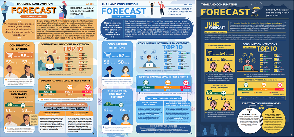 相反,为了应对各国本地客户的需求,需要对各国生活者进行更深入的洞察。于是从2021年开始,成立了专门研究泰国生活者的项目小组“HILL ASEAN (泰国)”。主要目的是向泰国的本地客户和本地媒体发送“生活者发想的博报堂”、“对泰国生活者最有深刻理解的博报堂”、“拥有泰国生活者研究专业智库功能的博报堂”等信息。从2021年2月开始发布名为《Thailand Consumption Forecast》的报告。根据针对泰国主要6个地区的1200名男女的调查结果,隔月发布,试着深入了解泰国生活者的意识。这是日本博报堂生活综研开发的独家手法,在日本从1993年开始实施。