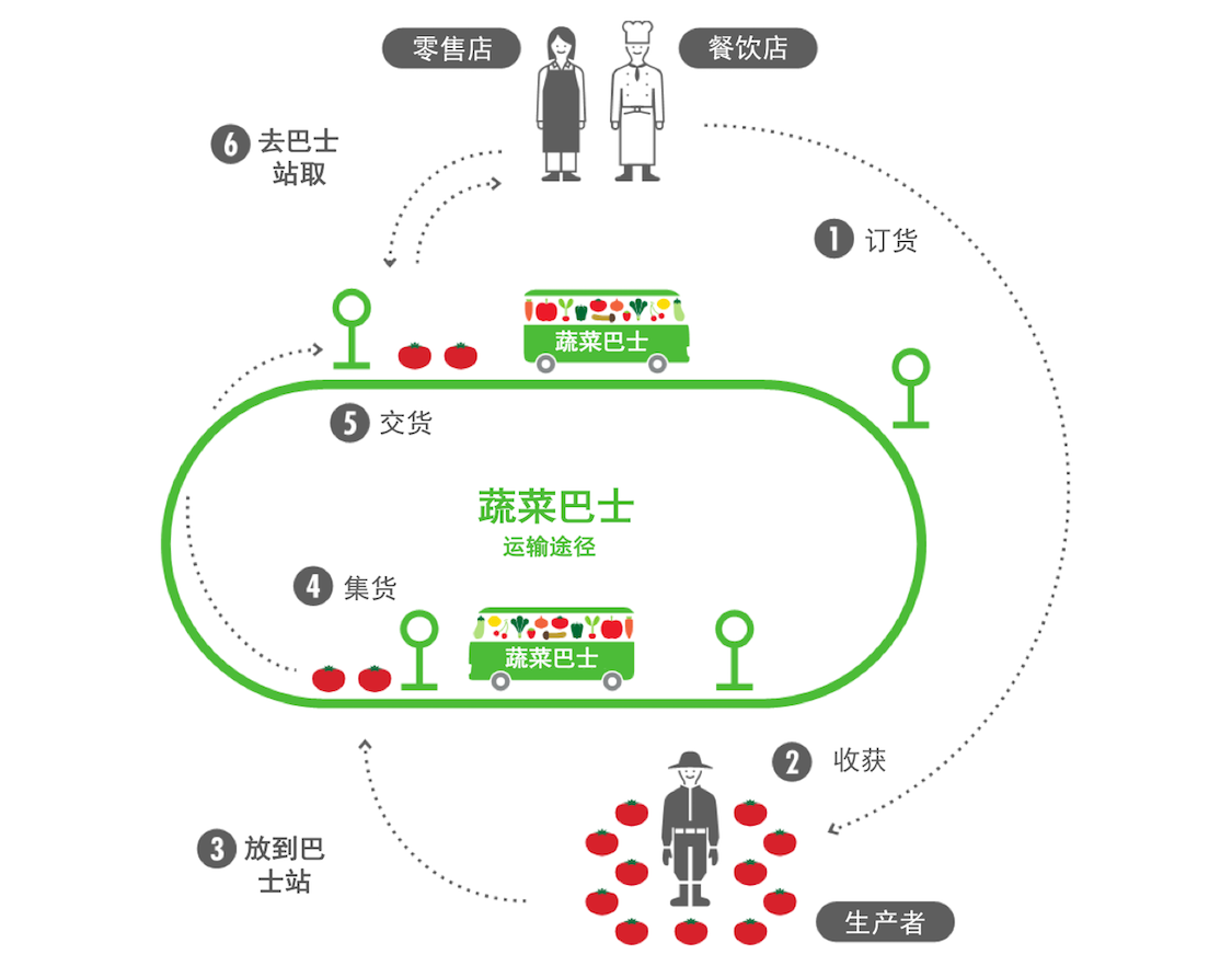 蔬菜巴士株式会社是一家设立于静冈县的社交初创企业。该企业通过运营联合配送物流系统“蔬菜巴士”,连接地区生产者和利用者。通过在在地区内巡回的冷藏卡车,将地区农民生产的农产品在当天送到餐厅和超市等地利用者手中,这种机制将会给生产者和利用者双方带来利益,从而促进地域经济的活性化。