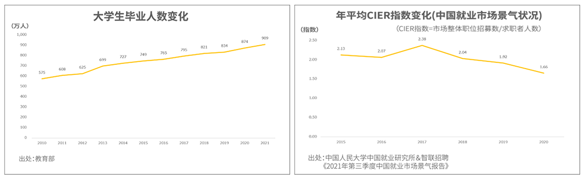 中国国内的大学毕业生数量年年攀升,去年该数字达909万人。但另一方面,受经济增速放缓及新冠疫情影响,各企业纷纷缩小招聘规模,应届毕业生的就业形势更加严峻。