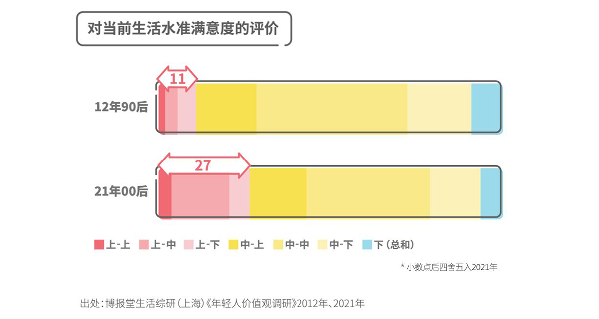 为了解过去近10年发生的变化,生活综研(上海)比较了分别在2012年和2021年针对18-21岁的年轻人进行的调研结果。在调研的设问中,生活水平被划分为“上-上”到“下-下”9个等级,回答“上”(含“上-上”、“上-中”、“上-下”)的占比从11%上升至27%,约增长了1.5倍。