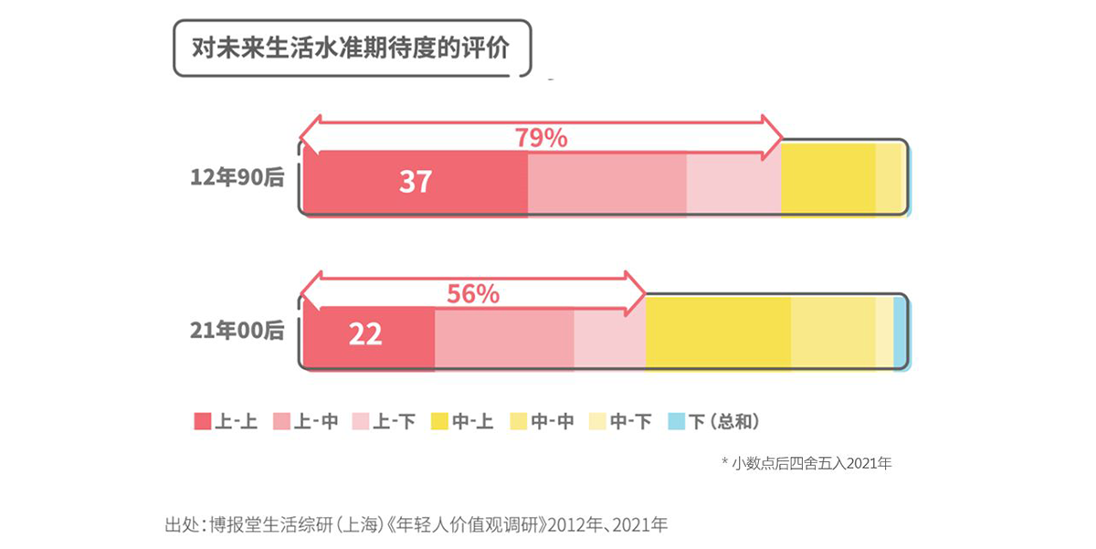 此外,当被问及对未来生活水平的预期,2012年的调研中回答“上”的占比为79%,其中“上之上”的占比为37%;但是在2021年的调研中,回答“上”的占比为56%,其中“上之上”的占比为22%,两者均有降低。这可以理解为,和近10年前相比,如今处于“中”的生活水平的提高也足够令人满意,不需要再辛辛苦苦追求“上”的生活水平。换言之,当代年轻人普遍认为目前的生活水平较高,对于“人上人”的追求意愿正在减弱。