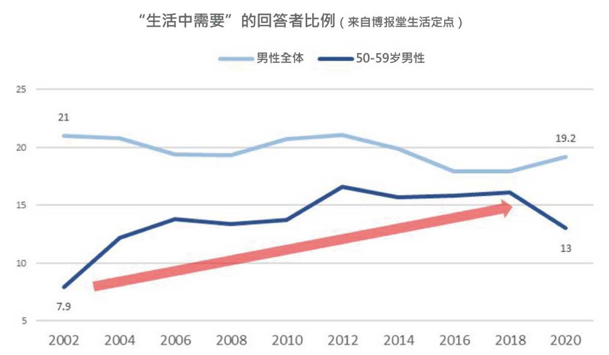 根据博报堂生活综合研究所的生活定点分析,“生活中需要刺激”的占比,从2000年代上半期开始,整体上在男性之中没有很大的变化,但50-59岁男性的占比增加了近一倍。
