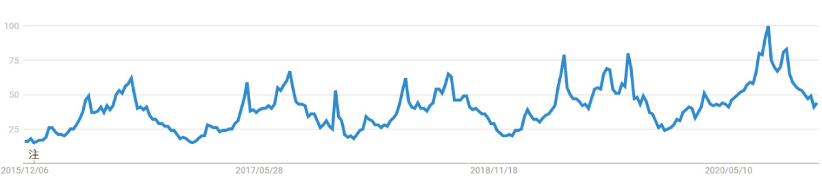 具有代表性的是露营。也因为新冠疫情的影响,露营热潮再次在年轻女性当中蔓延开来。观察最近5年的Google趋势,也可以发现露营热潮整体上在不断高涨。
