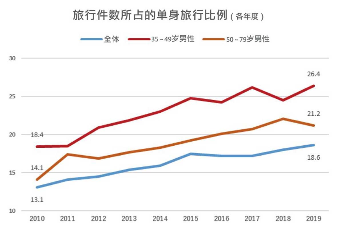 根据JALAN宿泊旅行调查显示,旅行件数所占的单身旅行比例累计人次,从2010年度到2019年度,整体来看增加了5.5%,而35~49岁男性增加了8%,50~79岁男性增加了7.1%,比整体的増长率要高。