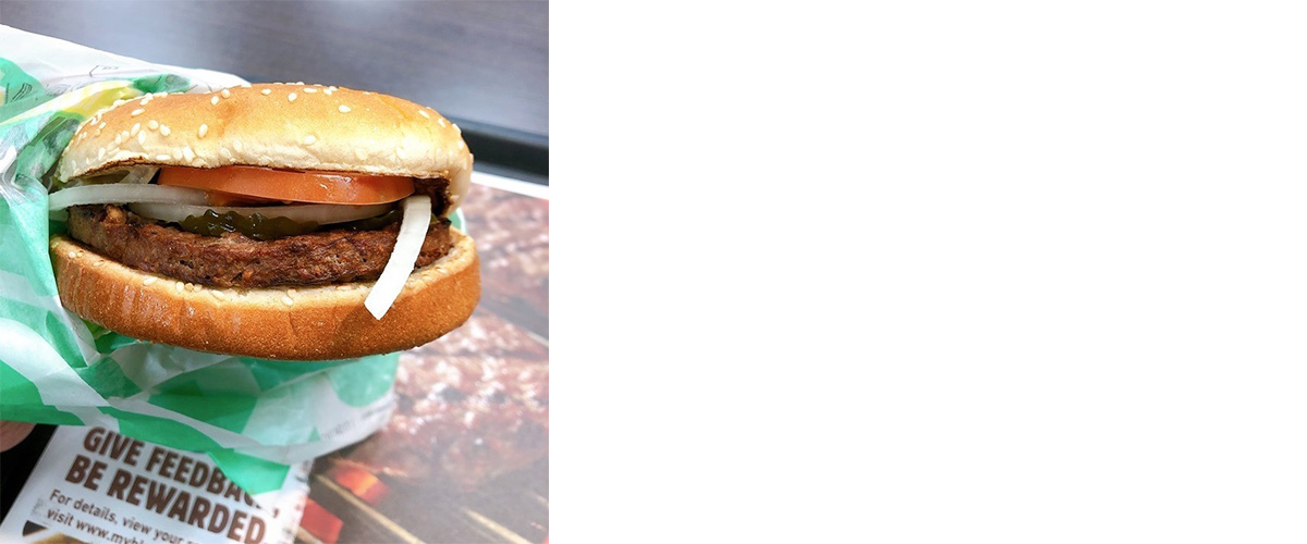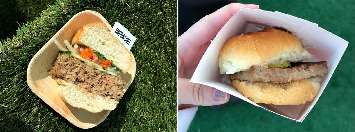 左图:在Impossible Foods展台试吃的猪肉三明治汉堡王招牌皇堡的肉类替代版“Impossible Whopper”中使用了Impossible Foods的肉饼。我们在参展期间也试吃了这款汉堡。若非有人点明,你甚至可能意识不到这款汉堡使用了肉类替代品。如果非要在鸡蛋里挑骨头,那么这款汉堡的饱腹感可能略逊于真肉汉堡,但你几乎无法察觉到其中的差异。此外,普通的汉堡带有660千卡的热量,而“Impossible Whopper”则有630千卡。看起来仿制肉也未必会降低你所摄入的卡路里。