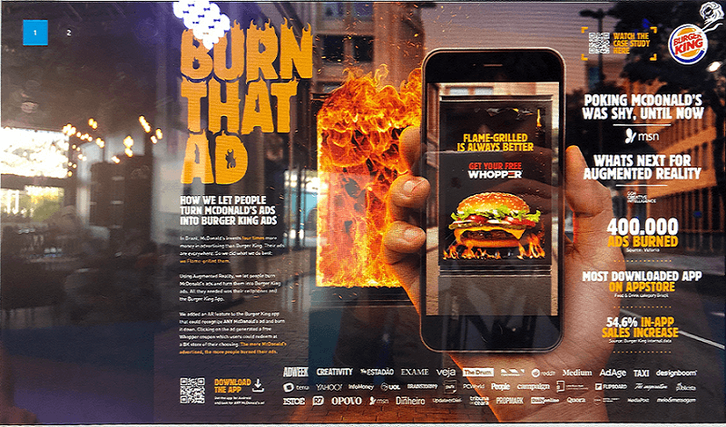 此外,还有用手机的APP照相机拍摄竞争对手的创意广告,通过AR(增强现实)技术将广告烧毁,→用户可获得优惠券的名为“Burn that Ad(烧掉那个广告)”的创意(@圣保罗)。同时这也是在宣传汉堡王的肉饼是直接用火烤的事实。