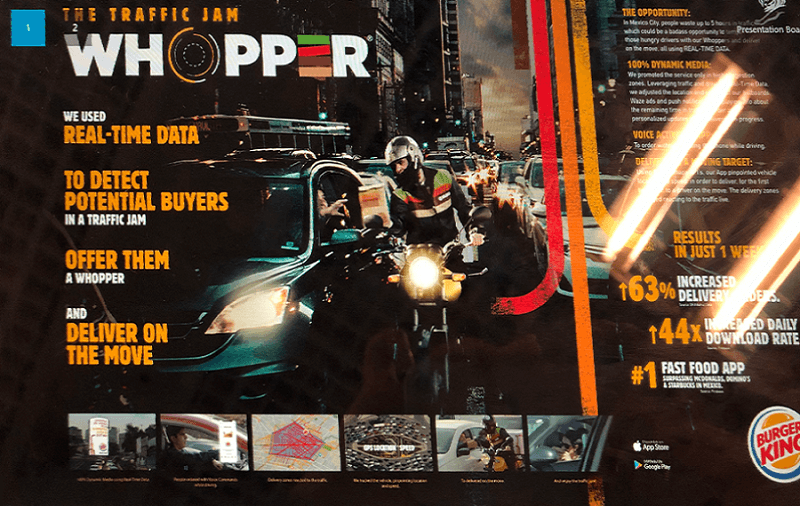 “汉堡王:烧掉那个广告”在堵车现象日趋严重的墨西哥城,根据APP的位置信息数据判断堵车场所,并与户外告知系统联动,提供汉堡王送货服务的“The Traffic Jam Whopper(堵车时的皇堡)”也成为了话题。
