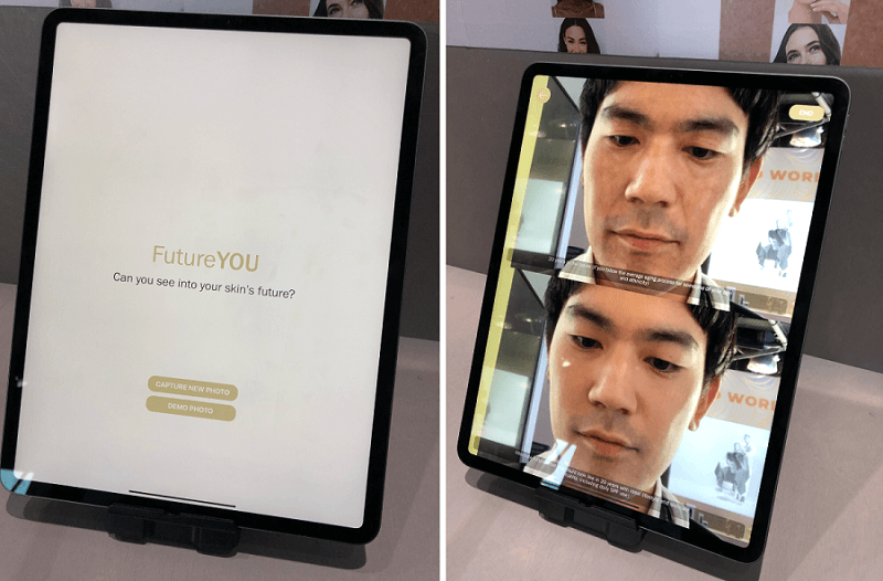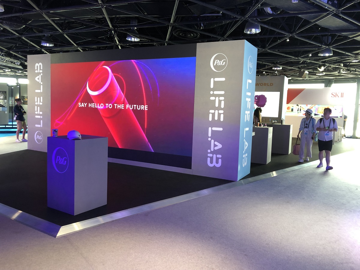 P&G也在会场一角设置了展示Life Lab(未来技术服务的原型)的展台。这里展示了面向店铺的指导皮肤年龄测试和皮肤护理指导的镜子、使用AI模拟出“没做皮肤护理你的20年后”的面部应用服务等原型产品。