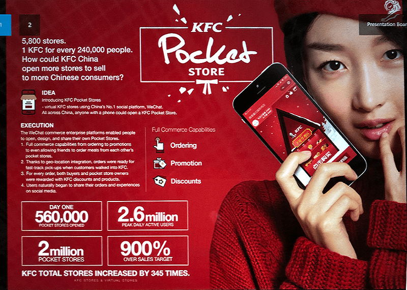 (品牌电商、CRM(客户关系管理)、销售管理均可能的平台)利用这样平台的有上海的肯德基(KFC)的“KFC: Pocket Store(口袋炸鸡店)”。获得Mobile·Creative eCommerce类金奖。