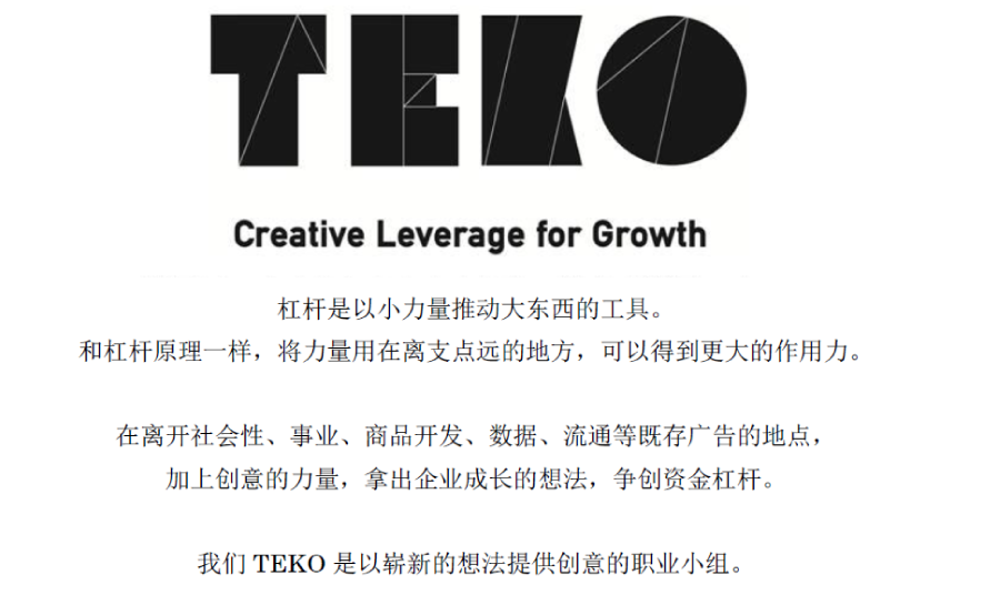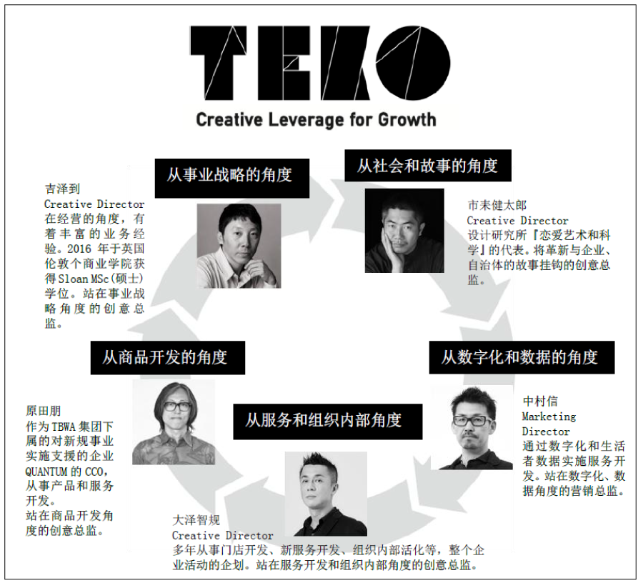 “TEKO”是由5名Creative Director(创意总监)/ Marketing Director(营销总监)联手打造的“co-direction(同向)”型项目小组。活动不仅仅限于广告和市场营销领域,还涵盖企业的事业战略和商品开发、服务开发、内部改革等,在广泛的领域开展活动。