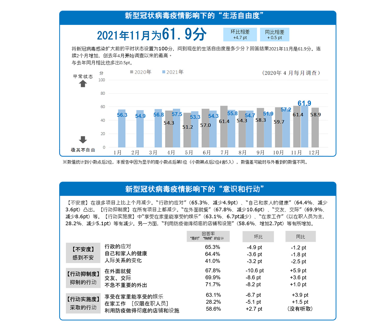 【调查前的状况】10月上旬全国感染人数为一千人左右,东京减少到一百人左右。新增感染者持续减少,11月1日达到今年最少的水平(全国75人,东京9人,大阪7人,爱知5人等)。重症患者减少,医疗的紧迫状况也得到改善。10月25日,关东、关西5都府县缓和了对饮食店的酒类提供限制和缩短营业时间的要求。从11月开始,针对27个都道府县举行大规模活动时的入场人数限制也有所缓和。对第6波的疫情担忧依然存在,就在饮食和旅行等服务开始出现恢复迹象的情况下实施了该调查。