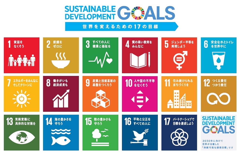 SDGs(Sustainable Development Goals可持续发展目标)是2015年9月,联合国通过的2016~2030年可持续发展议程,在15年中,争取实现的国际社会共同目标。解决世界问题,创造可持续发展社会,共同设立17个大目标和169的具体目标。本集团公司以创意志愿者(クリエイティブ・ボランティア)的身份与联合国广报中心合作和制作了SDGs官方日语版标识和公共广告影像。关于SDGs官方日语版标识请点击这里。