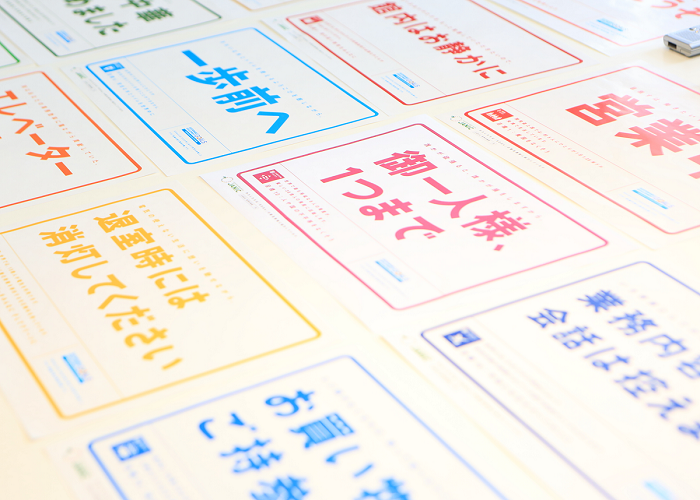 标语尺寸采用A4纸型,17张全部采用白边的设计,是因为用自家用打印机打印的时候,设计的图案也不会残缺。注重有手工制作感的设计。我们一边想象贴在办公室、住宅、图书馆等某个具体地方,一边进行了制作。