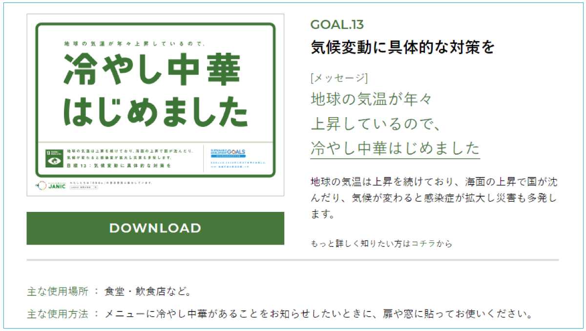 比如,关于目标13“采取紧急行动应对气候变化及其影响”的标语写着“地球的气温年年上升,我店推出冷面”。店里推出冷面估计地球温度不会下降(笑),如果将海报贴在离放空调附近的墙上,或许能成为让人们去思考地球变暖的契机。