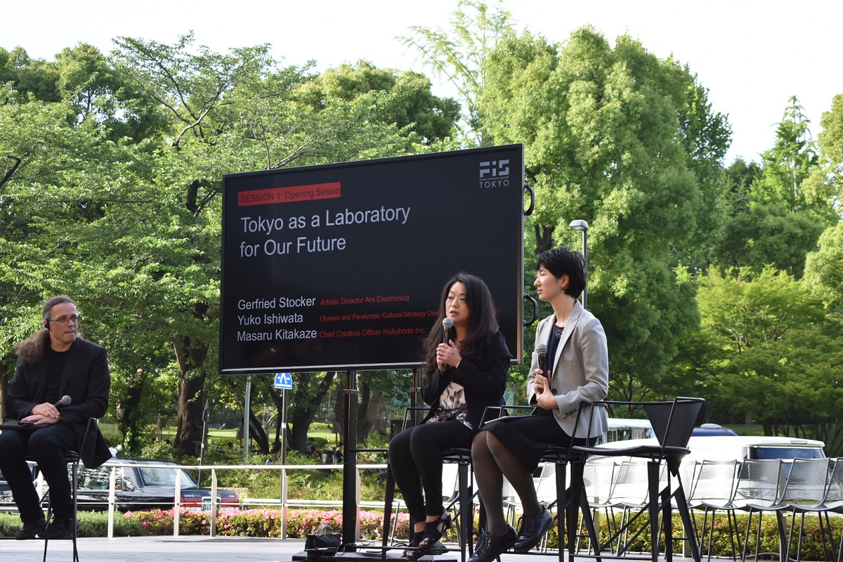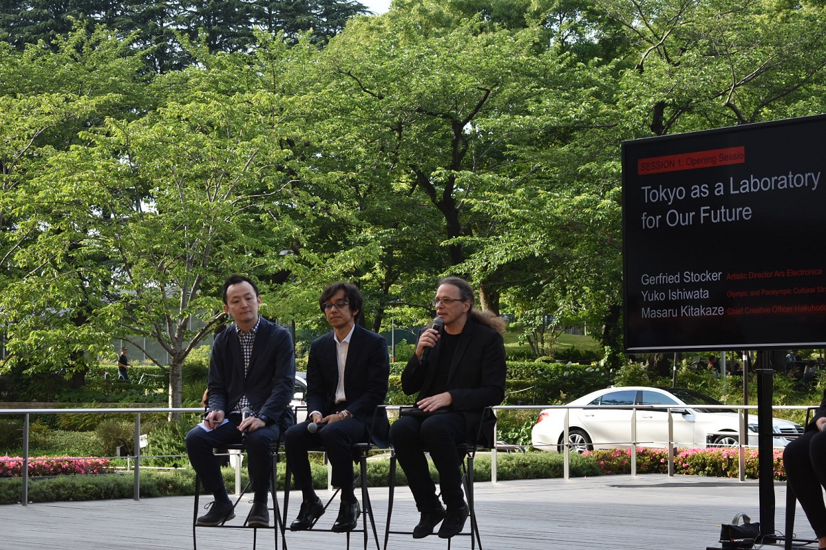 活动首日,在户外的庭院,举行了讨论会。在开幕式上,Ars Electronica的综合艺术导演Gerfried Stocker先生、Arts Council Tokyo的石绵裕子女士、博报堂的北风胜常务董事登台,谈了对本次活动的想法和寄予的期待。