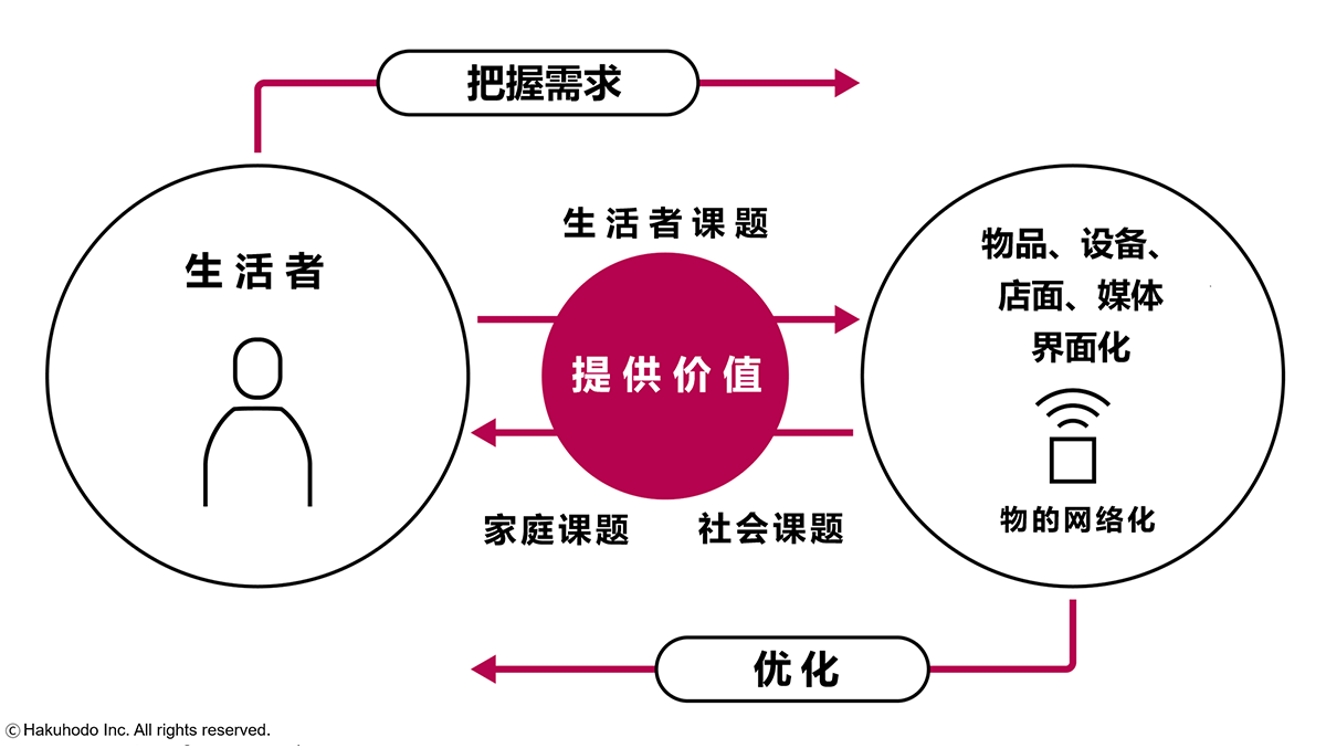 再详细点说就是,随着物品、设备、店面、媒体等的界面化的发展,通过数据就可以把握每个生活者的生活课题、家庭课题、其背景的社会课题等生活者的“需求”。然后企业可以提供最适合生活者需求的服务。也就是说,随着事物界面化的发展,通过企业和生活者之间产生的信息交流,可以创造价值、提供价值。这就意味着企业和生活者的关系在不断进化。现在,在各种各样的领域,企业和生活者正在形成新的关系。
