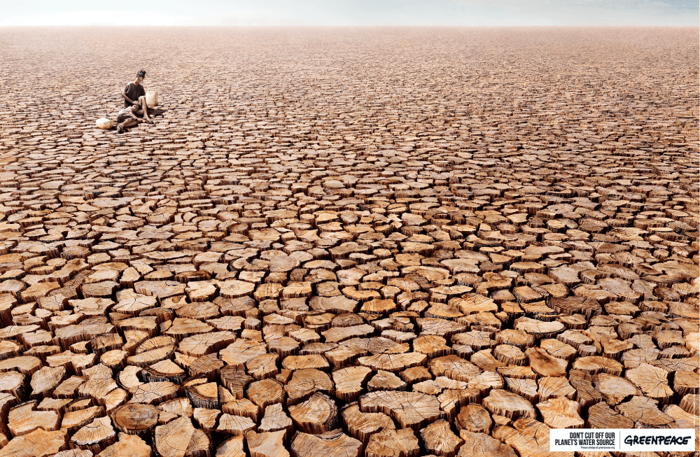 该平面广告描绘了一幅未来展望图,在此画面中,因干旱景观遭到破坏,肉眼便可看见,其中还呈现出这样的视觉扭曲景象:森林中的树木被砍伐,地球上形成了裂缝。广告在结尾部分做了警戒提示:“请勿切断地球水源。”当然,这项工作中的图形是用计算机创建的,实际上并没有砍伐树木。