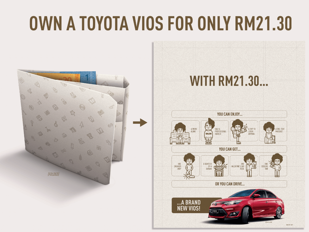 马来西亚博报堂还为客户提供更为积极的方案,其中另外一个案例就是其长期客户合顺丰田汽车的“海报钱包”。这项方案的开展正值马来西亚毕业季。该方案对丰田威驰进行了促销,并将其定位成一款对刚毕业、经济紧张的学生来说经济实惠的汽车,前提是这些学生需要使用“丰田毕业生易支付方案”汽车融资计划。