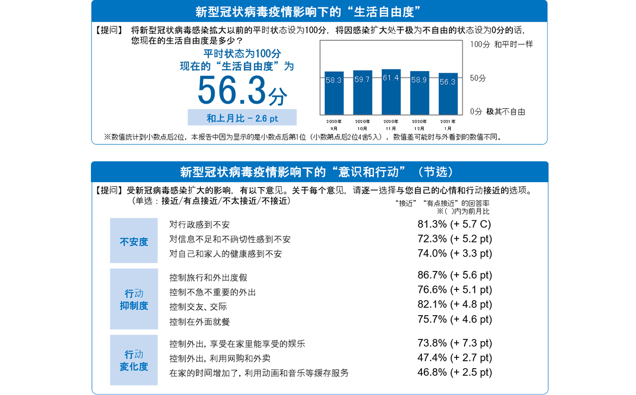 将新冠病毒感染扩大前的平时状态设置为100分,问到现在的生活自由度是多少分?回答结果为56.3分,从12月开始减少2.6个百分点。连续两个月减少。随着新型冠状病毒感染扩大,“不安度”继上个月之后,几乎所有项目都有所增加。本月“对行政感到不安”(81.3%,增加5.7pt),“对信息不足和不确切性感到不安”(72.3%、增加5.2pt)这两个项目的增加引人注目。“行动抑制度”和上个月一样,本月所有项目都有所增加。特别是“控制旅行和外出度假”(86.7%、增加5.6pt)、“控制不去买不急需的东西”(76.6%、增加5.1pt)等比较引人注目。“行动变化度”中,“控制外出,享受在家里能享受的娱乐”(73.8%、7.3pt增加)大幅增加。除此之外的项目没有很大的增减,但是“控制外出,利用网购和外卖”(47.4%、增加2.7pt),“在家的时间增加了,利用动画和音乐等缓存服务”(46.8%、增加2.5pt),此外在家中度过的相关项目稍有增加。可以看出,以11月为顶峰,由“外”向“内”转的生活者的意识和行动正在进一步加强。