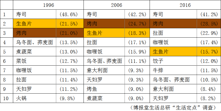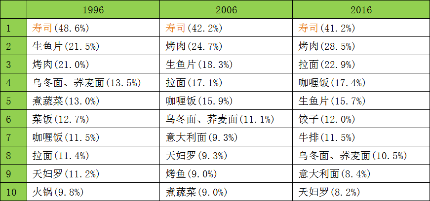 看看“喜欢的菜式前三名”,会发现从1996年起的20年来,“寿司”一直保持在第一名!不过说是寿司,其实还是分很多种的,比如柜台寿司、回转寿司、外带寿司等,有很多不同种类……。不管怎么样,有日本餐感觉的寿司是第一名。但是,也能做寿司材料的“生鱼片”却排名第2、第3、第5,不断地往下降,这就让我纳闷了……。
