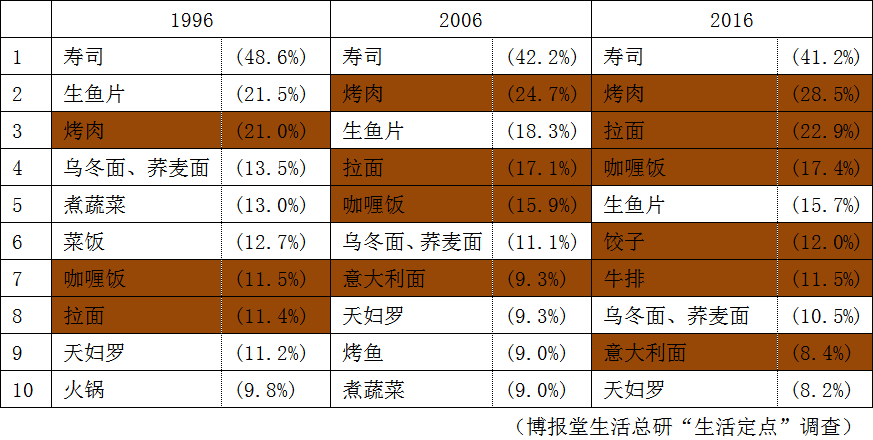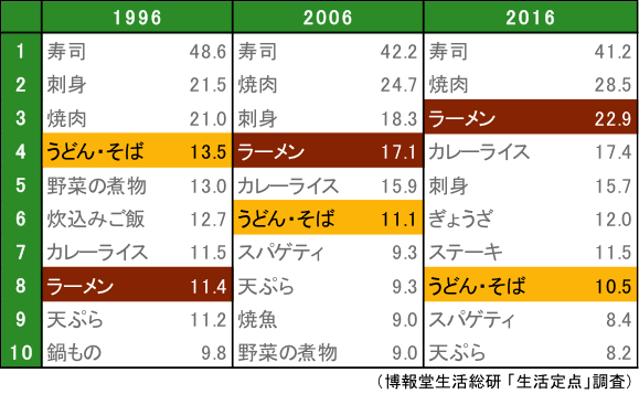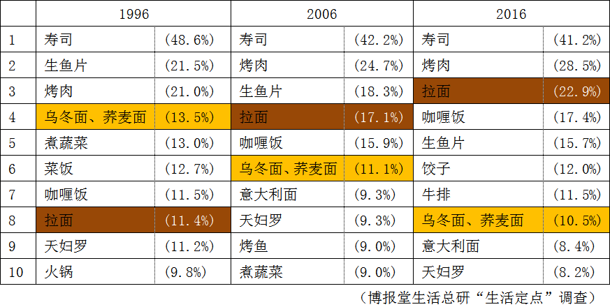 2016年“拉面”进入了前3名。实际上,它是步步紧逼,才占据了今天的位置。20年前“乌冬面、荞麦面”曾经胜过“拉面”,但在10年前排名发生了上下逆转,到了2016年,甚至拉开了两倍的差距。