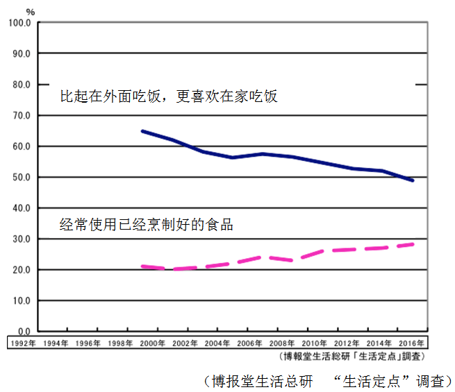 看到咖啡色的菜式,我想到的是它们每一种都是我们去外面吃饭时经常会吃的食物。同时,我们也经常通过真空包装、速食食品、冷冻食品吃这些东西。在“生活定点”中,跟随餐桌渐趋咖啡色的现象,“比起在外面吃饭,更喜欢在家吃饭”的人减少了,反过来,“经常使用已经烹制好的食品”的人有所增加。在外面吃饭的类型和在家吃外卖的类型确实在增加。