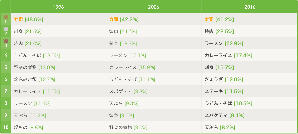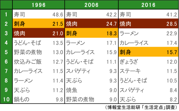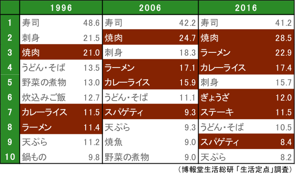 最后涂上颜色的是除了日本餐以外的菜式。这样来看的话,可以很明显地看到从欧美和亚洲进入日本的外来菜式的势力有所增强。2016年的前10名中,有6种是外来菜式。这几年来,外籍游客的增加成为话题,在餐饮的世界也受到了外来饮食的影响呢。各位请再次注意看一下涂上颜色的菜式。烤肉、拉面、咖喱饭、饺子……哪一种都是咖啡色的。是的,正如这篇专栏的标题那样,日本的餐桌已经被使用肉和油的菜式染上了咖啡色呢。
