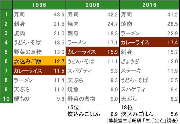 日本的餐桌上必不可少的就是大米。类似“日式菜饭”这种日本料理类的米饭从10年前起就已经跌出了前10名。反过来开始风靡的是以“咖喱饭”为代表的西式“Rice(源自外国料理里面的米饭)”。名称中带有“Rice(日料里的米饭)”的菜式如今已经多得数不胜数,比如蛋包饭、茄汁牛肉饭、墨西哥风味饭、土耳其饭等。