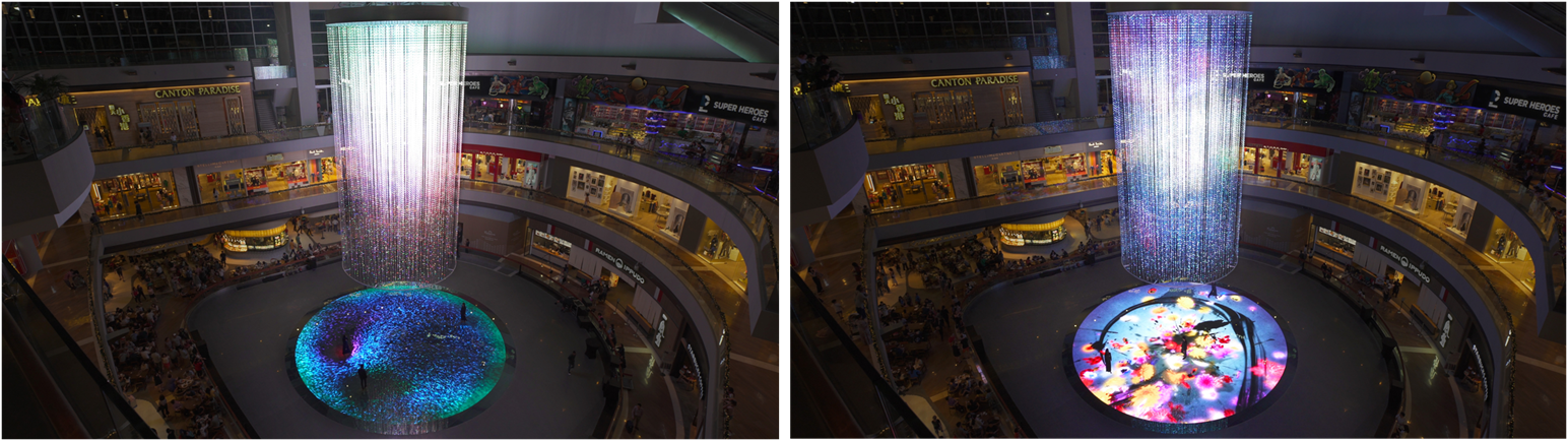 在新加坡滨海湾金沙购物商城,互动性的光创造出巨大的装置艺术空间,用数字艺术强调人们的存在。