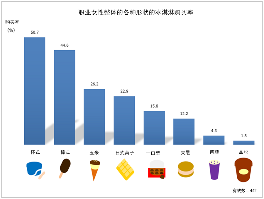 接下来,我们来看一下职业女性整体对于各种形状的冰淇淋购买率。