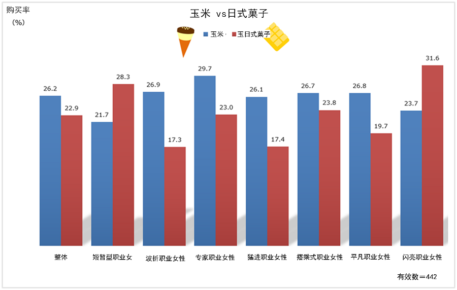 我们再来看一下各群体都喜欢什么口味的冰淇淋。首先比较一下人气较高的玉米和日式菓子。