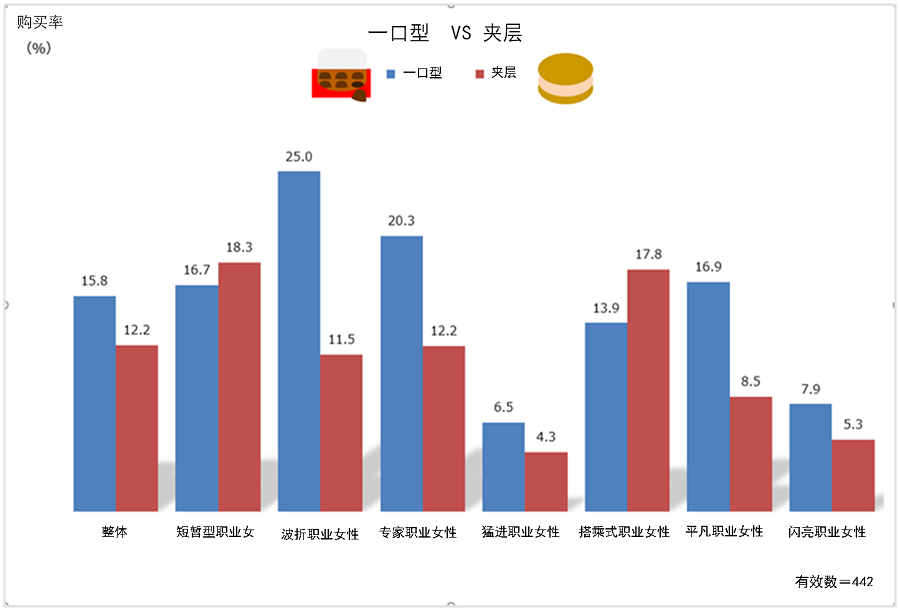 有社会地位意向、对于生活方式理想较高的搭乘式职业女性,对于冰淇淋的时尚感也要求颇高。与古风日式菓子相比,曲奇饼夹层多数情况具备西式包装和口味。可享受稍显奢侈的感觉似乎也是搭乘式职业女性的个人喜好。