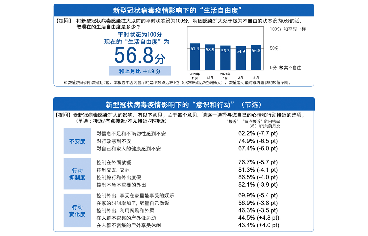 将新冠病毒感染扩大前的平时状态设置为100分,问到现在的生活自由度是多少分?回答结果为56.8分,从2月开始增加1.9pt。3个月连续减少得到了抑制。随着新冠疫情病毒感染扩大,“不安度”在“对信息不足和不确切性感到不安”(62.2%、减少7.7pt)、“对行政感到不安”(74.9%、6.5pt减少)以下全部项目减少。连续3个月所有项目都增加的“行动抑制度”全部项目在减少。特别是“控制在外面就餐”(76.7%、减少5.7pt)的减少引人注目,其次是“控制交友、交际”(81.3%、减少4.1pt)、“控制旅行、休闲”(86.5%、减少4.0pt)。“行动变化度”中,“控制外出,享受在家里能享受的娱乐”(69.9%、减少5.4pt)、“在家的时间增加了,尽量自己做饭”(56.9%、减少3.8pt)等与在家里的行为相关的项目减少。另一方面,“在人群不密集的户外运动”(44.5%、增加4.8pt)、“在人群不密集的户外享受休闲”(43.4%、增加4.0pt)等,关于在户外活动的项目增加了。生活者的意识和行动以去年11月为界,从“外”不断向“内”转变,但好像又开始转向“外”。