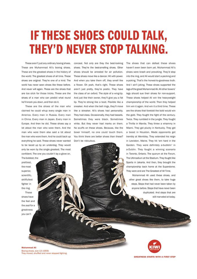 首届Industry Craft类最高奖是“First Steps: Ali(第一步:阿里)”作品,这是由奥美芝加哥为庄臣的Kiwi Shoe Care创作的平面广告。精心制作和研究活动的一部分包括寻找四位伟大的美国人的原创鞋子并讲述他们的故事,获奖作品为穆罕默德•阿里的拳击鞋。该活动还追踪了欧内斯特•海明威、亚伯拉罕•林肯和阿米莉娅•埃尔哈特的鞋履。杨耀淙说,“这里虽然没有出现阿里的形象,但是当你阅读这段文案时,你就可以感觉到阿里在拳击台上跳舞。你几乎能闻到他的气息。”他还说,“在有这么多松散推文的时候,能认识到文案的力量真的令人很高兴”。
