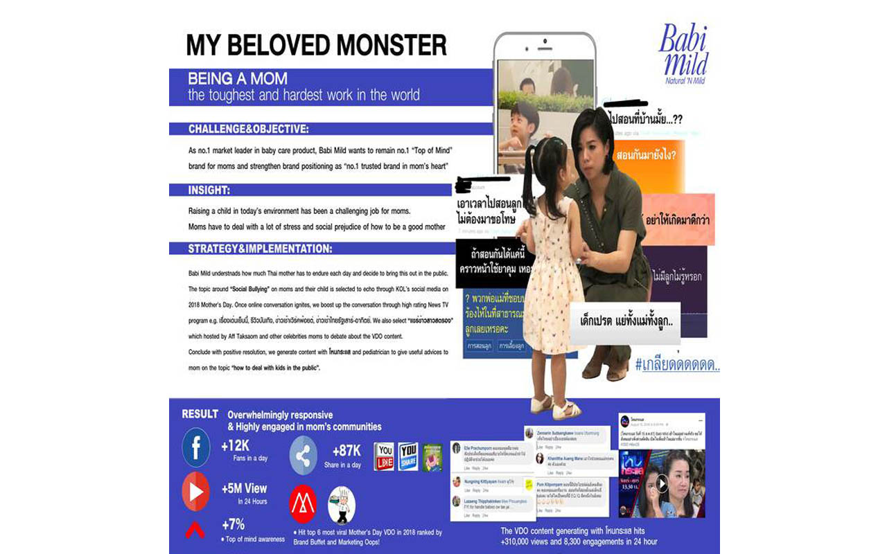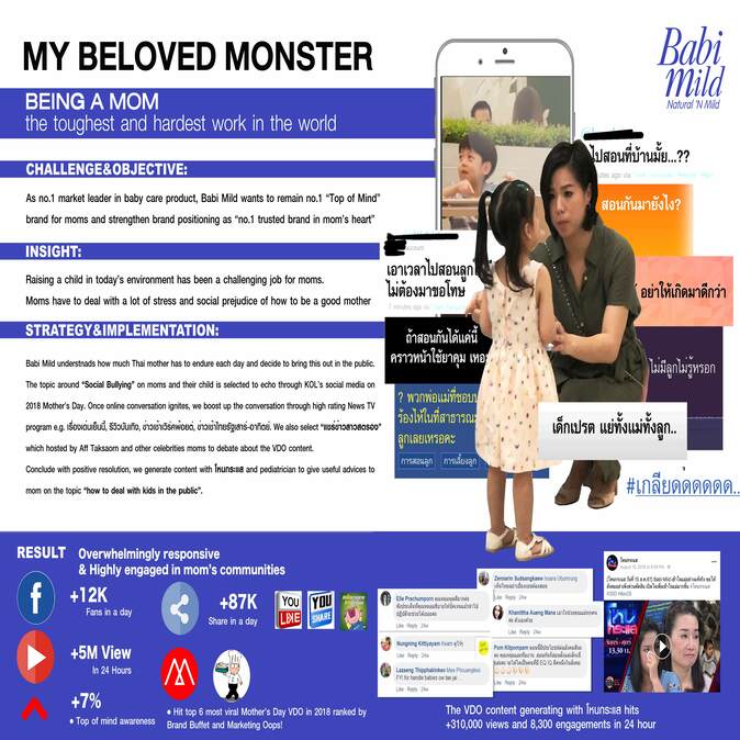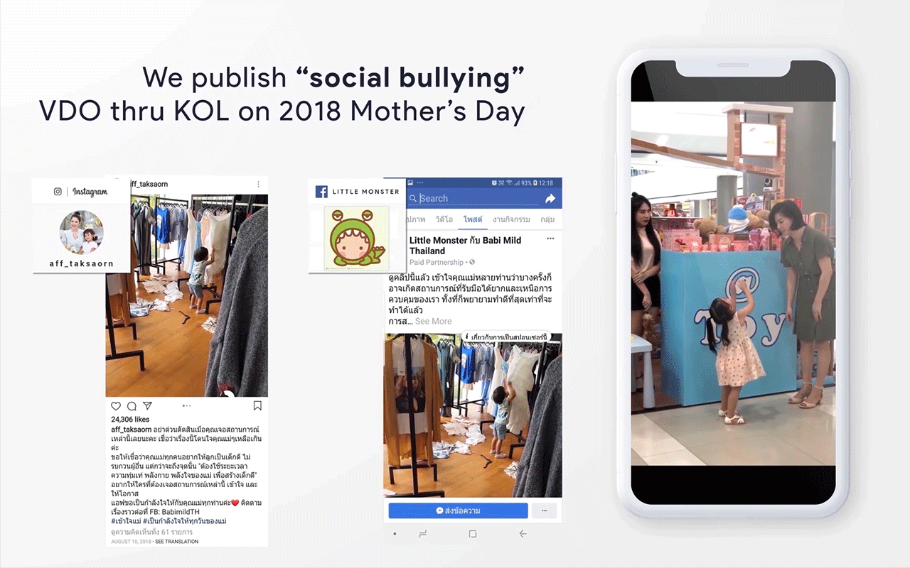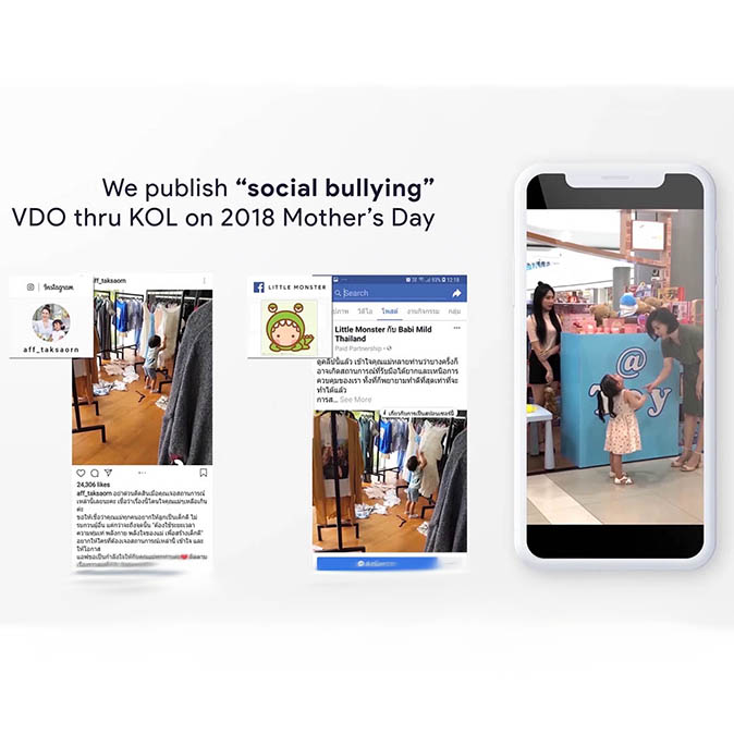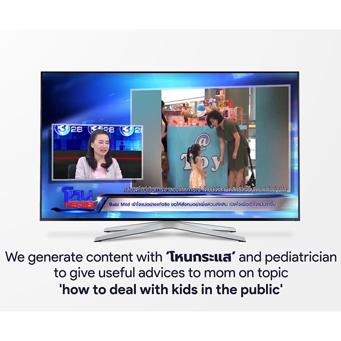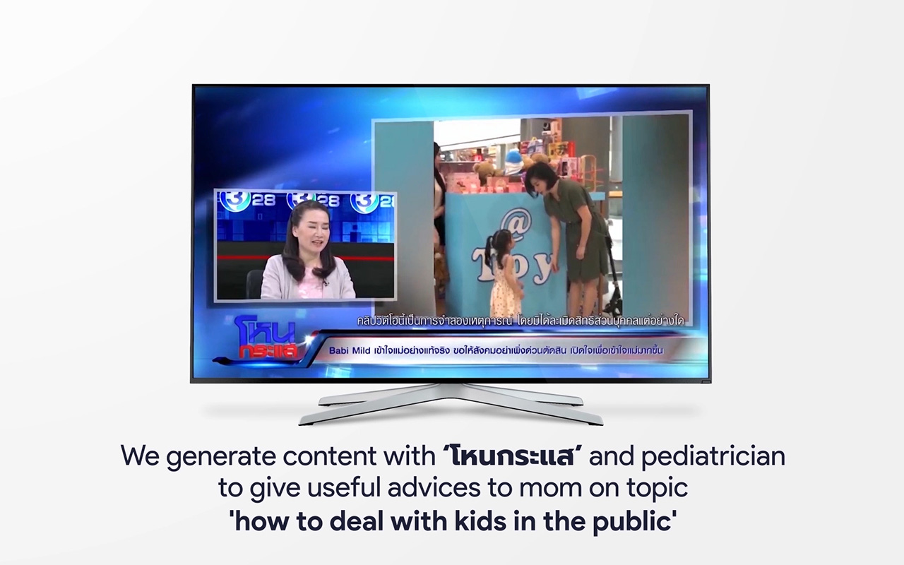 对于泰国的母亲来说,养育孩子已经成为一项巨大挑战,在“如何才能成为一名优秀的母亲”这个问题上,她们需要面对沉重的压力和社会偏见。Babi Mild理解泰国母亲们每天的艰辛感受,并决定引起公众对此问题的关注。我们选择了“母亲和孩子遭受的社会欺凌”这一话题,并在母亲节这一天邀请多位社交媒体上的KOL享他们的见解,旨在引起大众的共鸣。在线上引发热议后,我们还借助一档高评分的电视新闻节目进一步造势。为了确保活动的积极性,我们与一名儿科医生一起,为母亲们提供了“如何在公共场合照顾孩子”的有用建议。