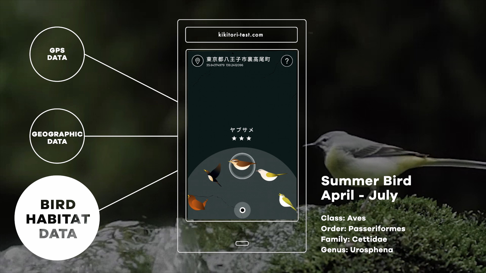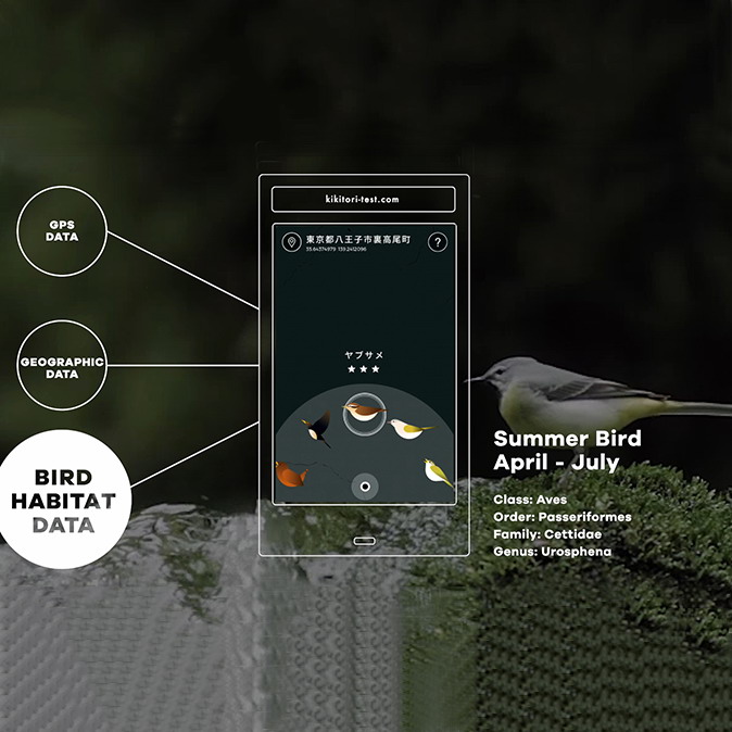 如果人因为衰老而出现听力障碍,那么首先听不到的就是高音。所以老年人很难听见高音的鸟鸣。我们基于这一情况,将鸟鸣声变为了测试听力的工具。而为了帮助人们找到野生的鸟类并轻松检查自己的听力,我们设计了一款移动应用,它会利用全球定位(GPS)、地理环境和鸟类栖息地的数据来侦测附近的野生鸟类。